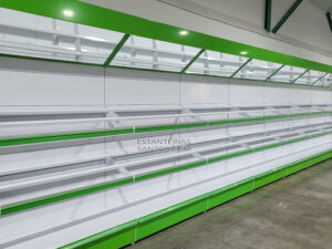 Estantería sistema de cremalleras de 1,80m de altura y medida de largo a elegir con 4 bandejas reforzadas de 0,40m fondo con portaprecios scaner colora elegir. fabricado en chapa de acero pintado en blanco.
