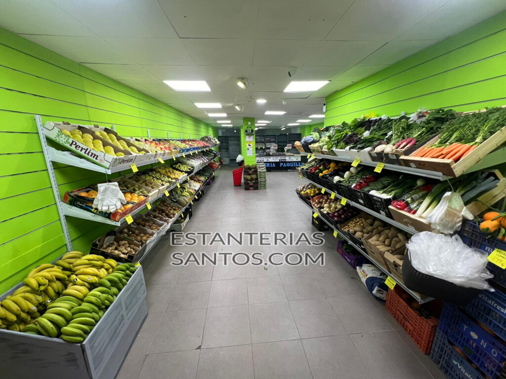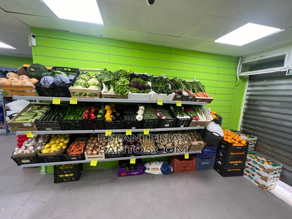 Estantería tipo cremallera pared especialmente para fruterías con 3 bandejas inclinadas para cajas de frutas.Chapa de acero pintado en blanco.