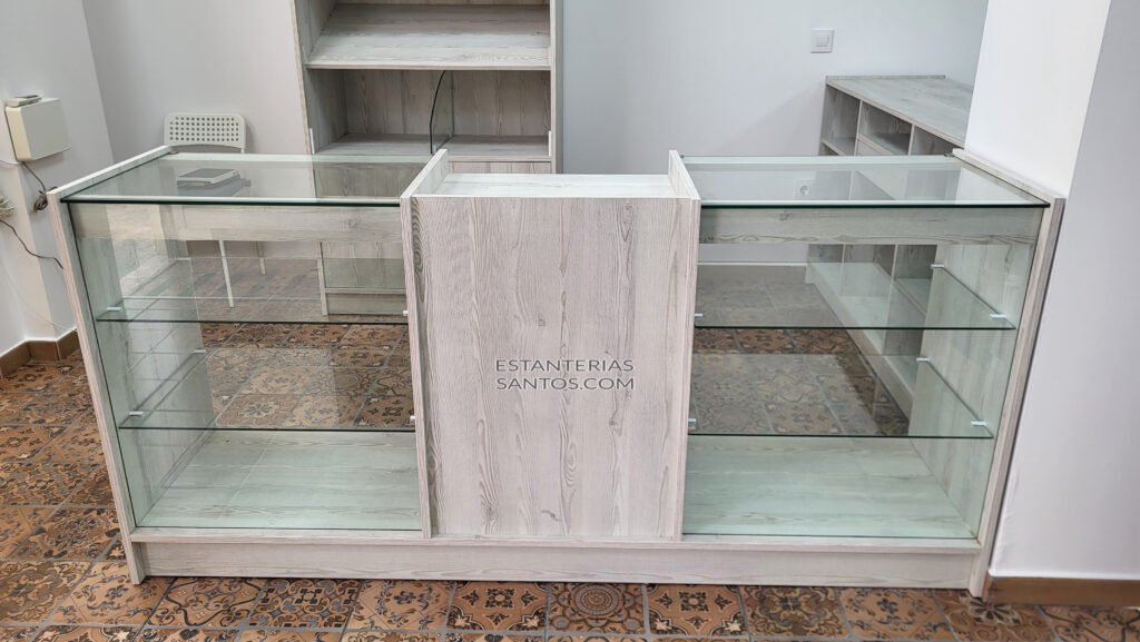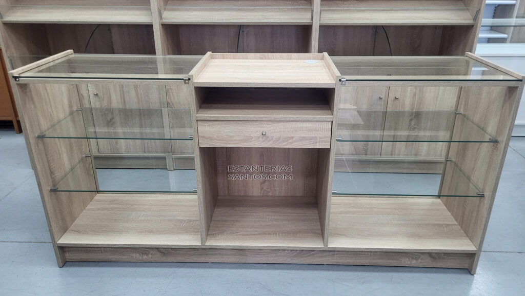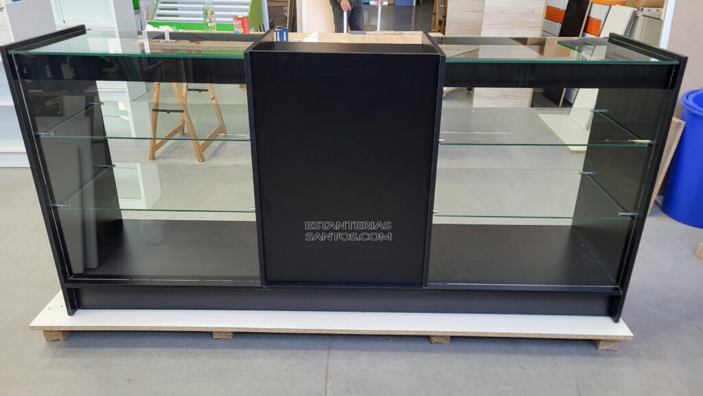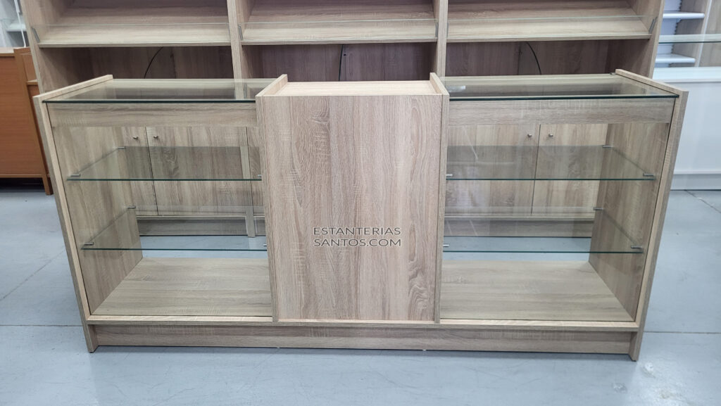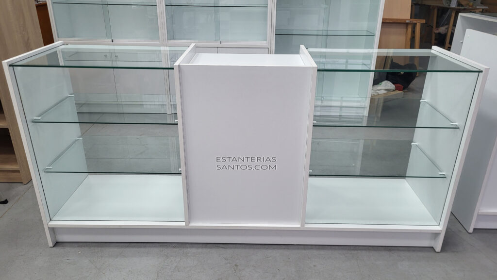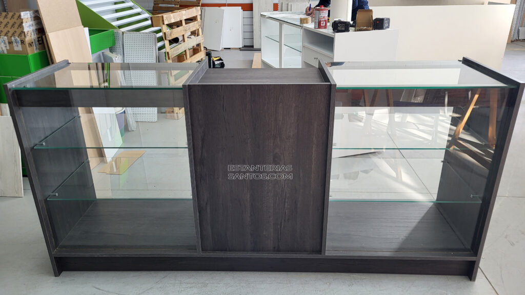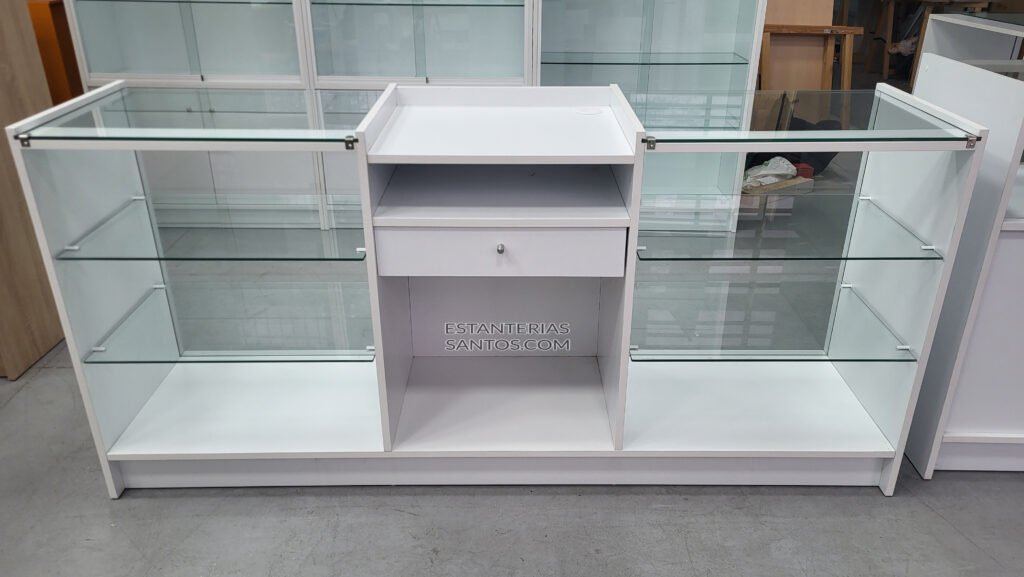 Mostrador mixto con vitrina completa con caja central de 2metros de largo, de 0,95m alto x 0,50m fondo, de gran calidad disponible en diversos colores y medidas.