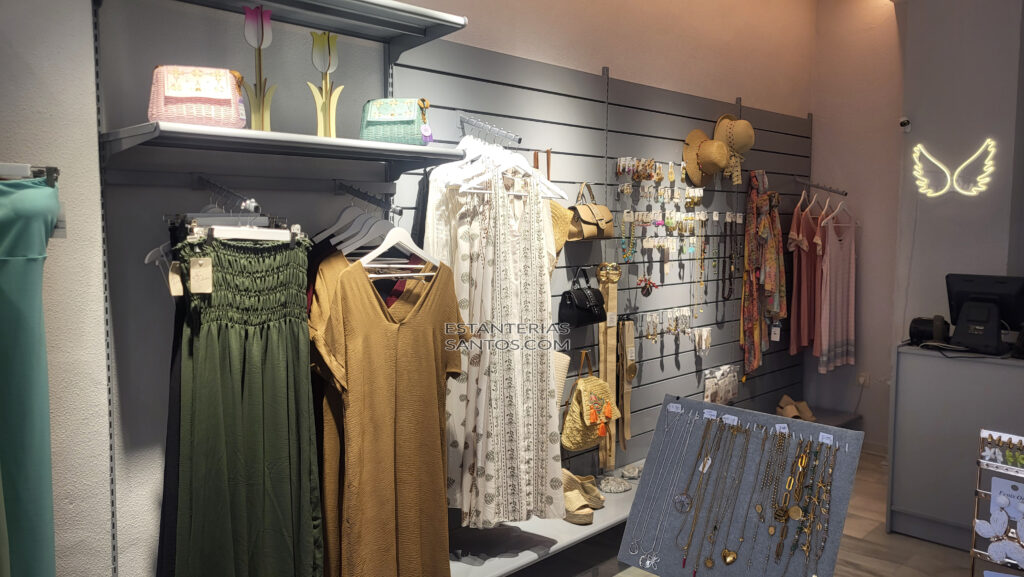 Se compone de cremalleras de 2,20m alto (atornilladas a pared), panel fondo liso de 30cm de alto (colocado en zona baja) + 14 paneles lamas metalicas de 13,2cm alto .
